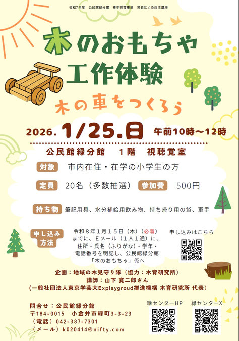 木のおもちゃ工作体験ー木の車を作ろう 10:00 AM – 12:00 PM2026年1月25日 ◆2026/1/25(日)10:00-12:00 公民館緑分館にて 主催:公民館緑分館 参加費:500円 カレンダーを表示