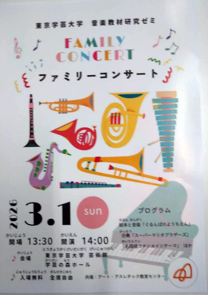 東京学芸大学 ファミリーコンサート 2:00 PM – 3:00 PM2026年3月1日 ◆2026/3/1(日)14:00- 学芸大にて 参加費:無料 共催:東京学芸大学 アート・アスレチック教育センター >FBはこちら カレンダーを表示