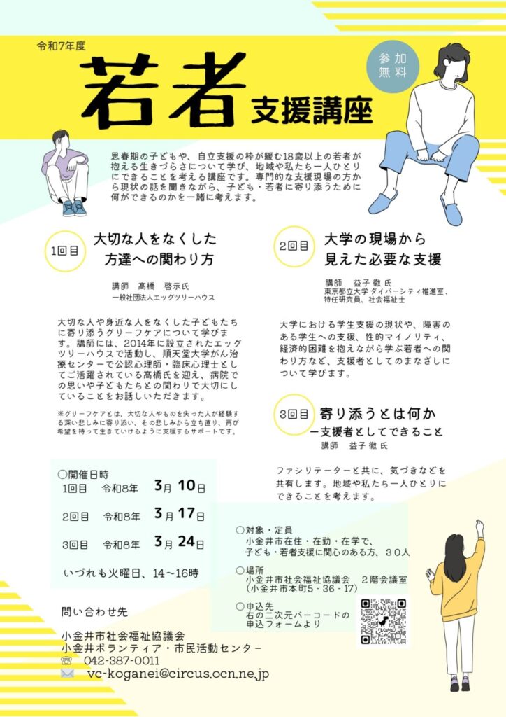 若者支援講座 2:00 PM – 4:00 PM2026年3月24日 ◆2026/3/10, 17, 24(火)14:00-16:00(全3回) 社会福祉協議会にて 参加費:無料 主催:社会福祉協議会 >詳しくはこちら 申し込みフォーム カレンダーを表示