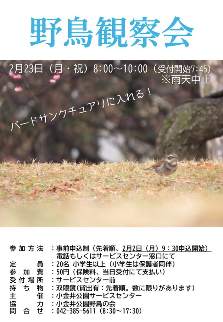 野鳥観察会(小金井公園) 8:00 AM – 10:00 AM2026年2月23日 ◆2026/2/23(月・祝)8:00-10:00 小金井公園にて 参加費:50円 主催:小金井公園サービスセンター >詳しくはこちら カレンダーを表示