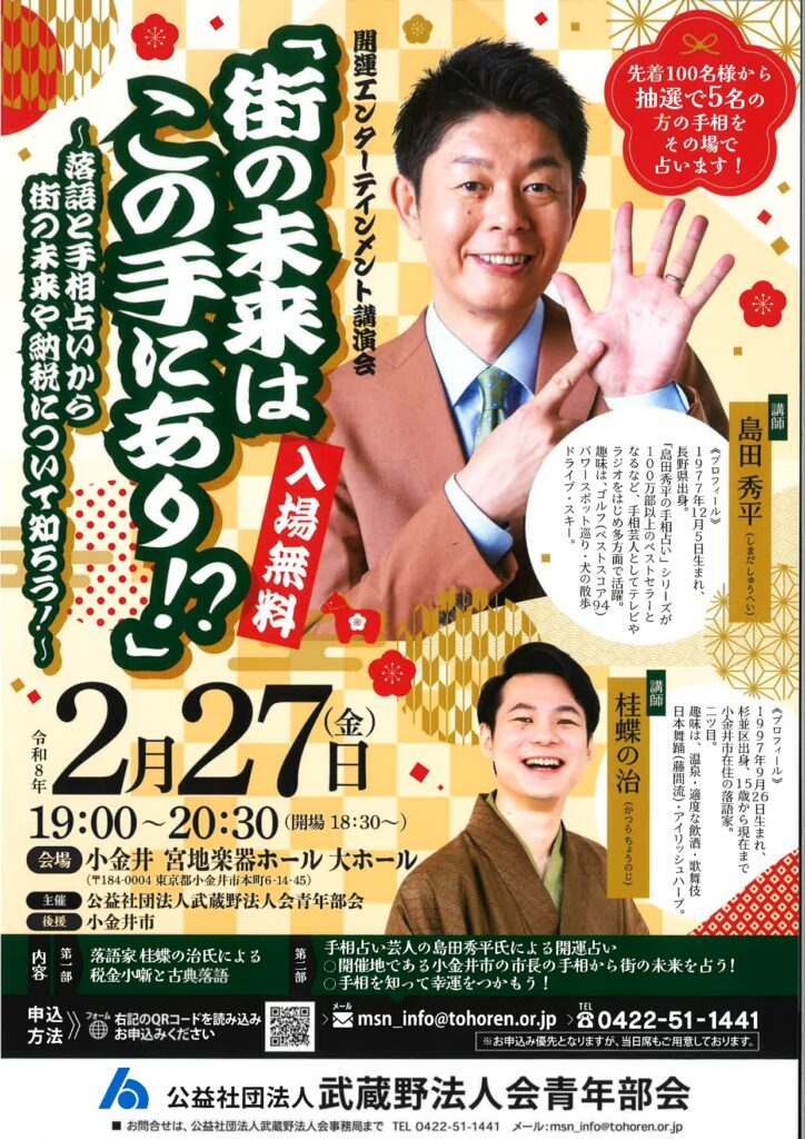 開運エンターテインメント講演会 「街の未来はこの手相にあり!?」 7:00 PM – 8:30 PM2026年2月27日 ◆2026/2/27(金)19:00-20:30 宮地楽器ホールにて 参加費:無料 主催:武蔵野法人会青年部会 >詳しくはこちら 申し込みフォーム カレンダーを表示